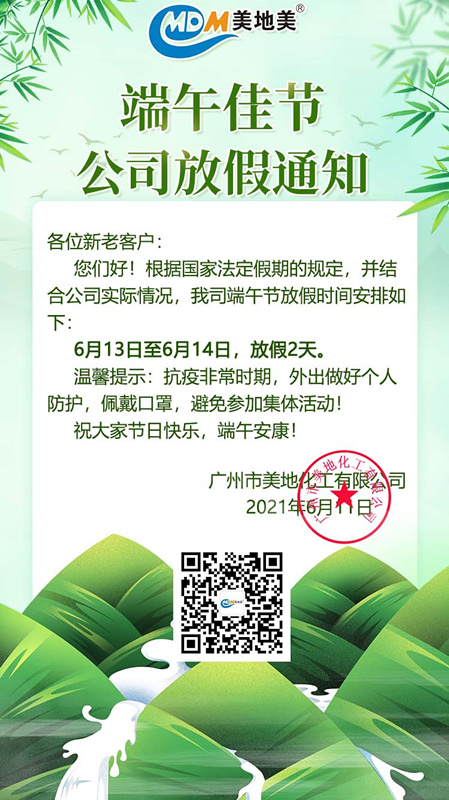 即將迎來端午佳節(jié),廣州市美地化工有限公司現(xiàn)就2021年端午節(jié)放假安排通知如下:2021年6月13日至6月14日放假,共2天。節(jié)日期間,希望大家提高防范意識,加強自我防護。出行期間佩戴好口罩,勤洗手,盡量減少外出逗留時間,少去人員密集場所,并準(zhǔn)備好健康碼,積極配合查驗和體溫檢測等工作。